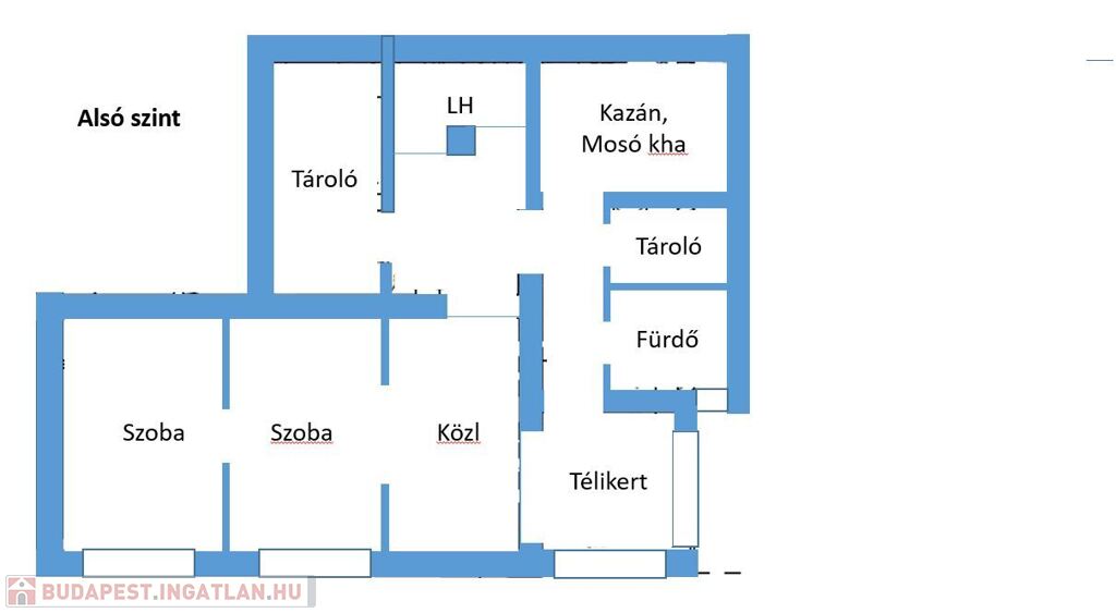 3 egymásba nyíló szoba, - amelyek hálószobáknak, iroda-, és játék-szobáknak is alkalmasak, + padlófűtéses télikert terasz-, és kert-kapcsolattal, + WC-s zuhanyzó, + mosókonyha vízmelegítő tartállyal, központi fűtés kazánjával , + 2 tároló helyiség.