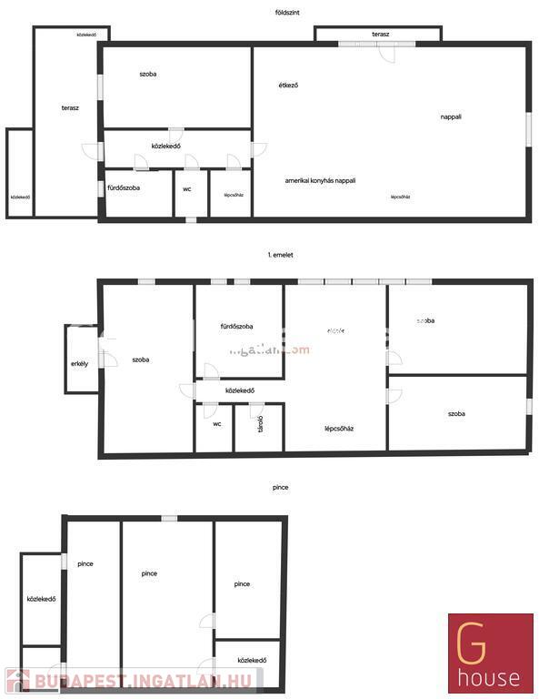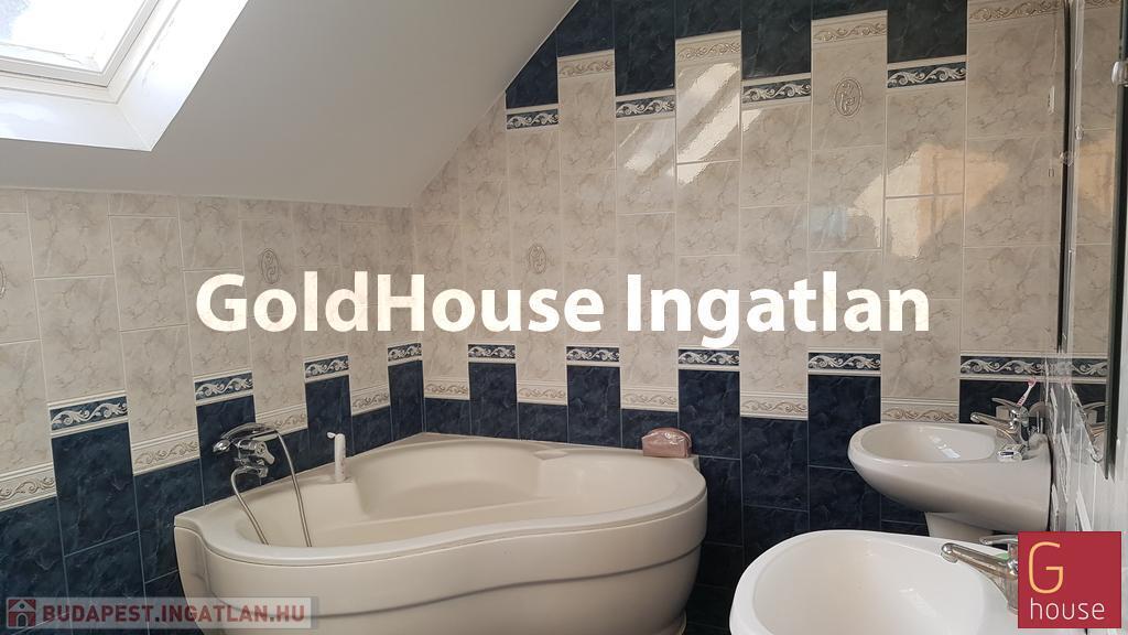 A nappaliból vezet az emeletre a lépcső, ahol egy nagy és két kisebb hálószoba található. A nagyobb szobához kis udvarra néző erkély csatlakozik. A pihenőből kis folyosón keresztül vezet az út a nagy sarokkádas fürdőszobába. (Szemben a wc bidével.) (Mindkét fürdőben mosógép kiállás van, felső szinten mosógéppel.)