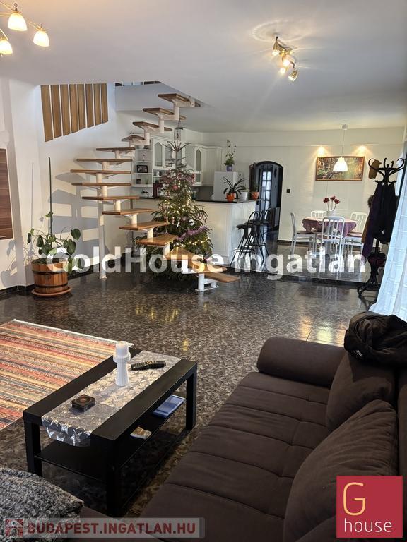 Két szintes. Alul egy 54 nm-es nappali, egy jól felszerelt amerikai konyhával, étkezővel és egy közlekedővel csatlakozó lakrész egy szobával, fürdővel. (Külön wc). A nappaliban élmény kandallós fűtőtest.