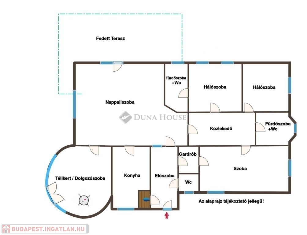 A lakótérben egy hatalmas nappaliszoba, 3 külön bejáratú hálószoba, egy hangulatos télikert (fűtött, szobaként szintén remekül használható), két fürdőszoba+wc (az egyik a szülői hálóhoz csatlakozó privát fürdőszoba), egy külön wc, egy ablakos konyha, egy előszoba, és egy a helyiségeket összekötő közlekedő helyiségek kaptak helyet. A legnagyobb hálószobához gardróbszoba is csatlakozik, továbbá a helyiség konyhapulttal is felszerelt, így akár önálló apartmanként is jól használható. A nappaliszobából hatalmas, több, mint 30m2-es fedett teraszra léphetünk ki, mely szeparált, belátástól mentes pihenést kínál a nap minden szakában.