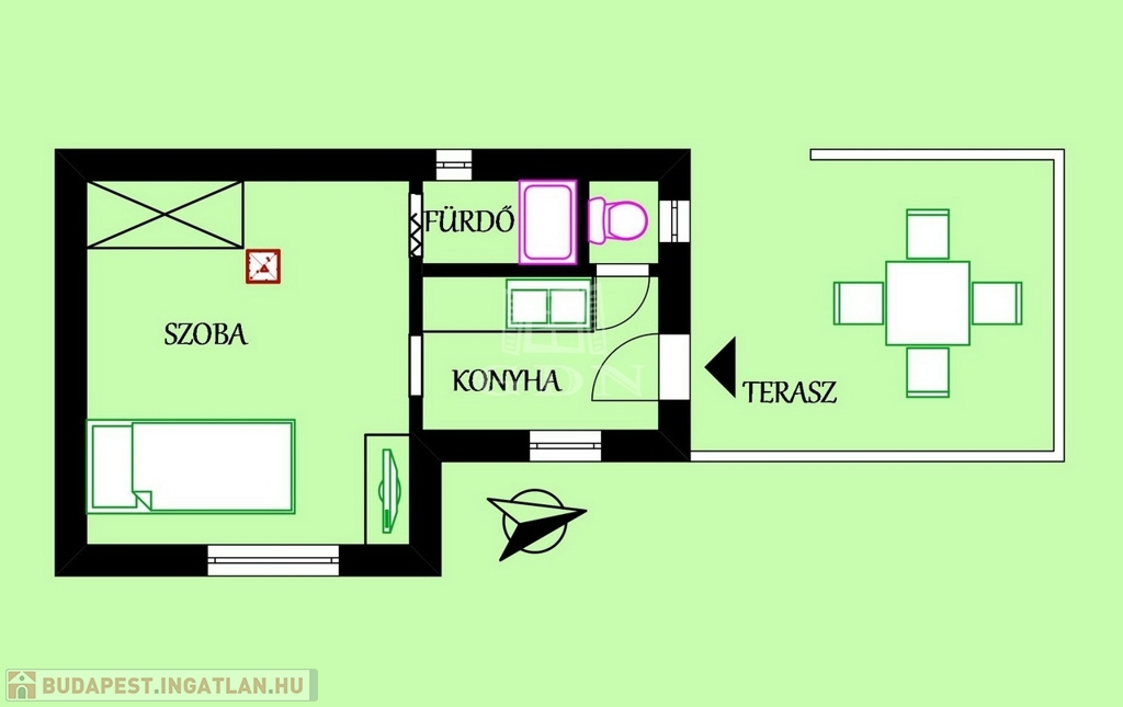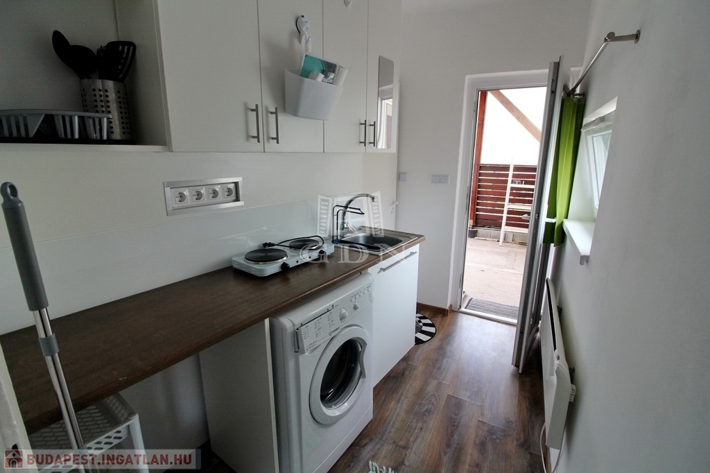 A közelben Tesco, kisebb boltok, piac, orvosi rendelő, mind megtalálható. A minigarzon egy kertes ház melléképületében található, az udvar és az autóbeálló közös, de a lakás teljesen elszeparált. A pár éve teljeskörűen felújított épület megújult kívül belül, szoba, tusoló, külön WC, és egy kis konyha kapott helyet benne. A képen látható berendezésekkel, (mosógép, hűtő, rezsó, egy személyes kinyitható ágy, komód, szekrény, könyves polc) hosszútávra, de minimum egy évre kiadó. A fűtésről modern elektromos panelek gondoskodnak, minden fogyasztás külön mérő óra alapján fizetendő. Közös költség nincs, TV és internet használat a bérleti díjon felül fizetendő.