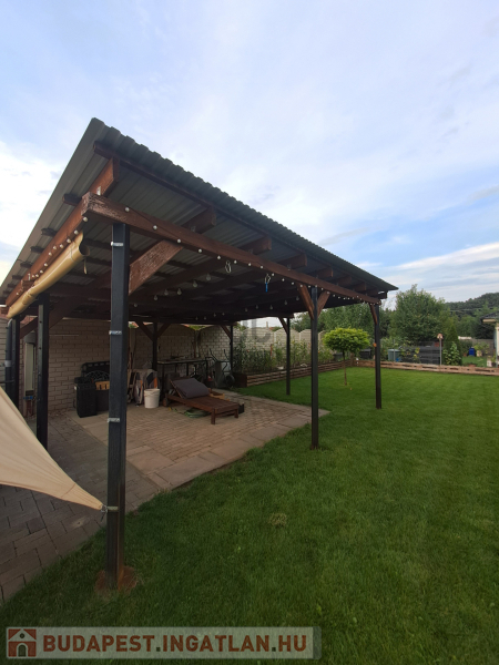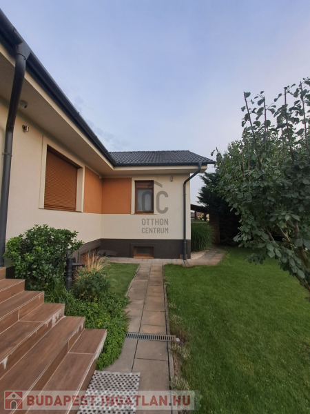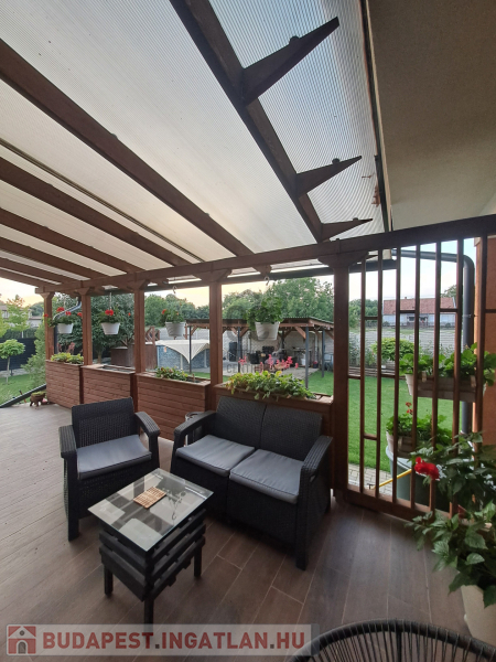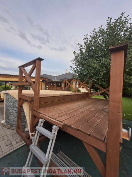 430 m² teljesen parkosított kert automata öntözőrendszerrel , örökzöldekkel, filagóriával, magas ágyással, ellenáramoltatós, hőgenerátoros 3,5 méter átmérőjű, medencével,