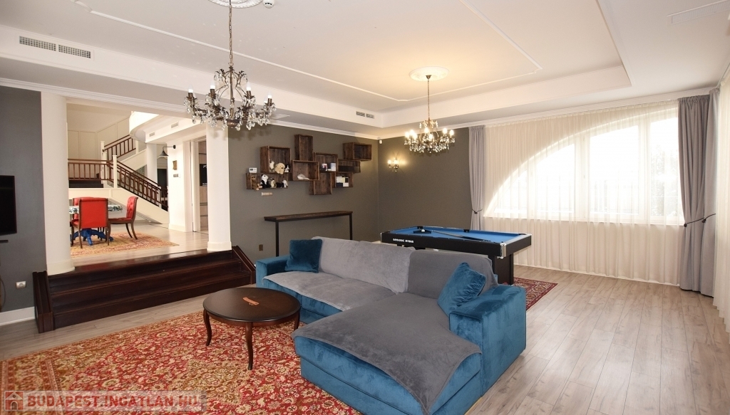 Földszinten található egy tágas nappali kandallóval, biliárdasztallal. Hatalmas étkező-konyha, mely elszeparálható igény szerint. A nappalin kívül van egy szintén tágas szivarszoba, mely használható társalgónak, irodának egyaránt vagy éppen egy külön lakrésznek is.