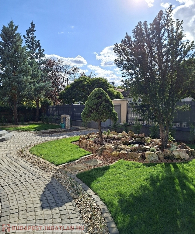 Az udvar öntözőrendszerrel felszerelt, így a sok örökzöld, virág, fű minimális karbantartást igényel. 10-15 növényeket, fákat megvilágító kerti lámpák az esti kerti sétákhoz. Sziklakert és vízköpő egyik és másik végén az udvarnak, hogy garantált legyen a kerti öröm. A kinti grillezőn, sütni kedvelőknek fedett főző rész füstkivezető üsttel. A dupla garázsban (50nm) wc, praktikus monolit födém jó belmagasság padlástér plusz tárolási lehetőség.