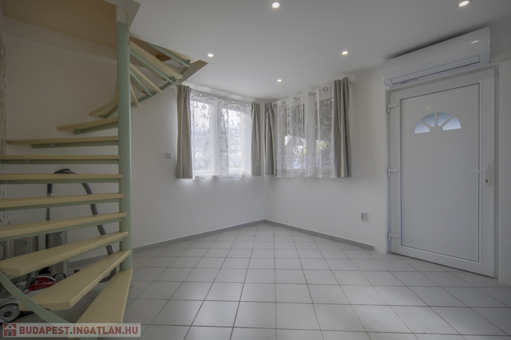Bruttó 34 m2-es, belső két szintes, 2 szobás, klimatizált, nagy teraszos kertes ház kiadó Ecseren, a Zártkerti dűlőn.