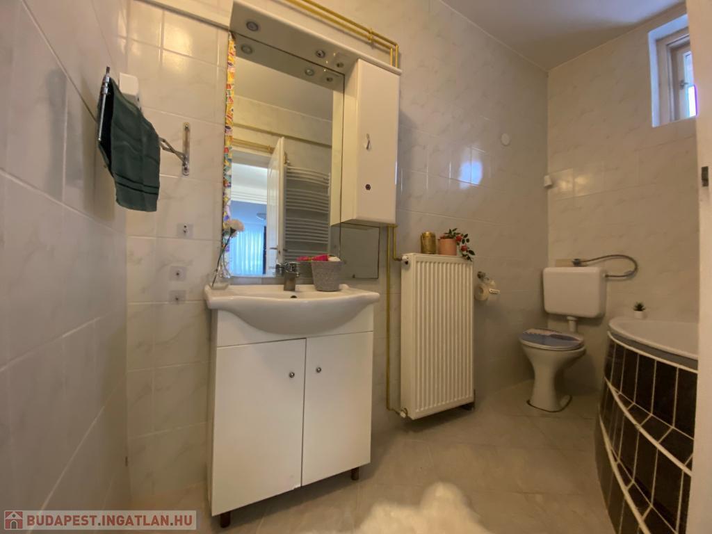 A fürdőszoba ablakos, sarokkádas, WC-vel egyben kialakított.