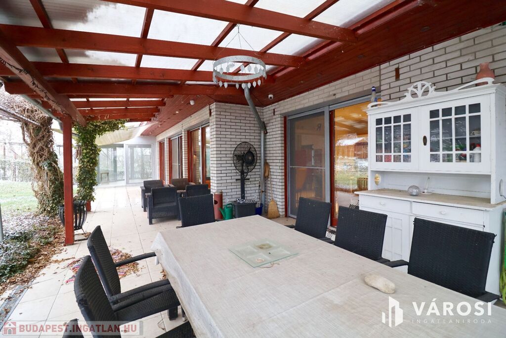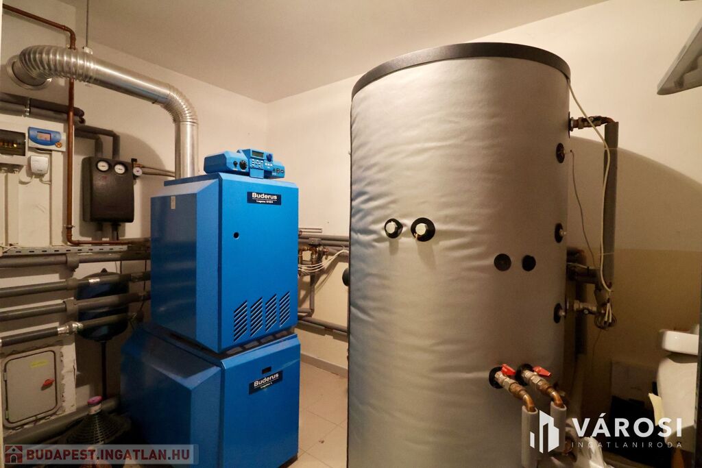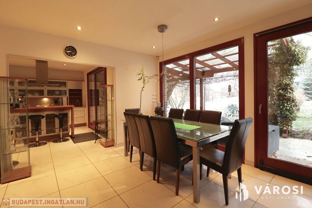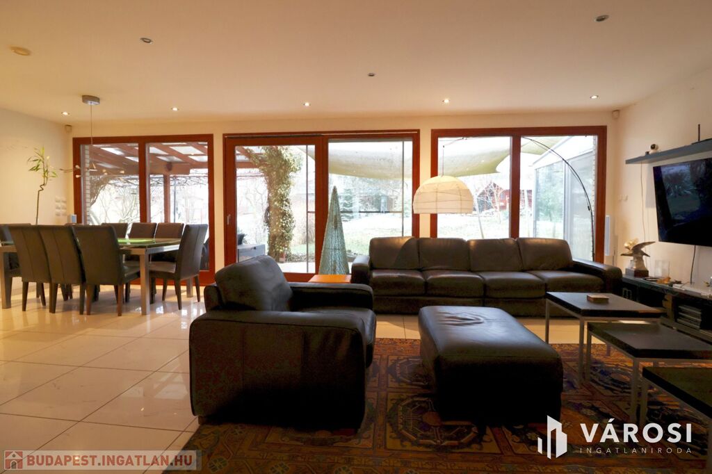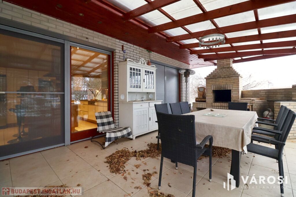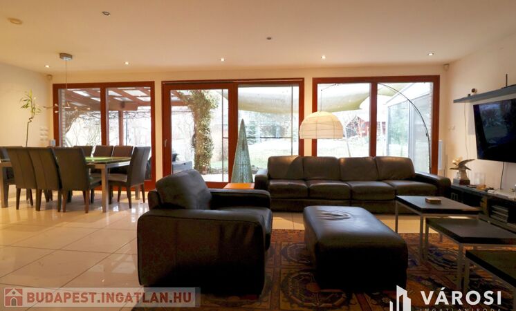 Tágas Nappali és Étkező helyiségben helyett kapott egy látvány-kandalló, innen nyílik a beépített teljesen felszerelt Konyha és a Dolgozó-szoba. Ezen a szinten lévő három hálószobához saját fürdőszoba tartozik. A Téli-kert a Dolgozó-szobából és a teraszról is megközelíthető. Az ~58,00 m2 fedett, burkolt terasz - kültéri sütögetővel - növeli a lakótér kihasználhatóságát. A kétállásos garázs ~ 44,00 m2. Központi fűtést egy Buderus Logano G 124 kazán -csökkentett káros-anyag kibocsátású, teljesen automatikus üzemű -biztosítja.