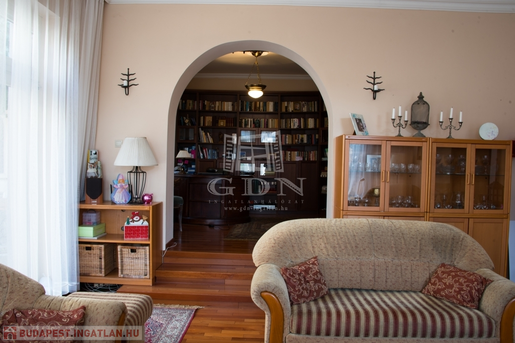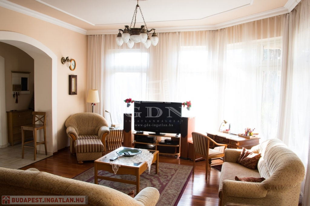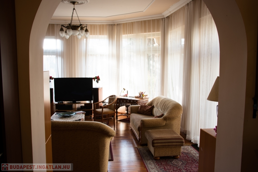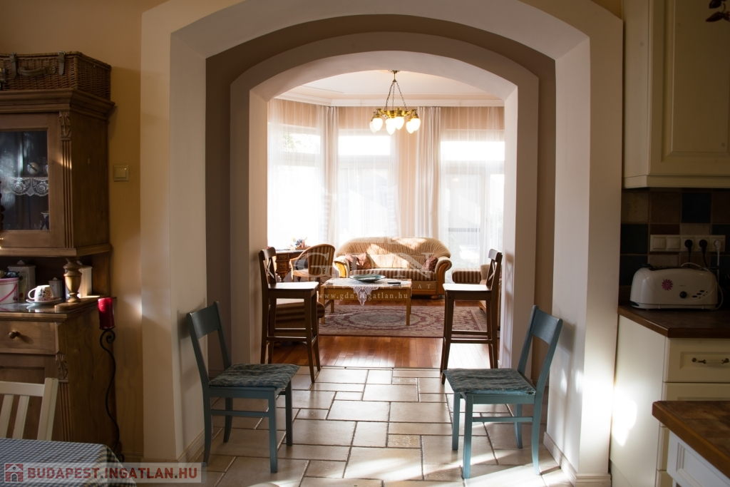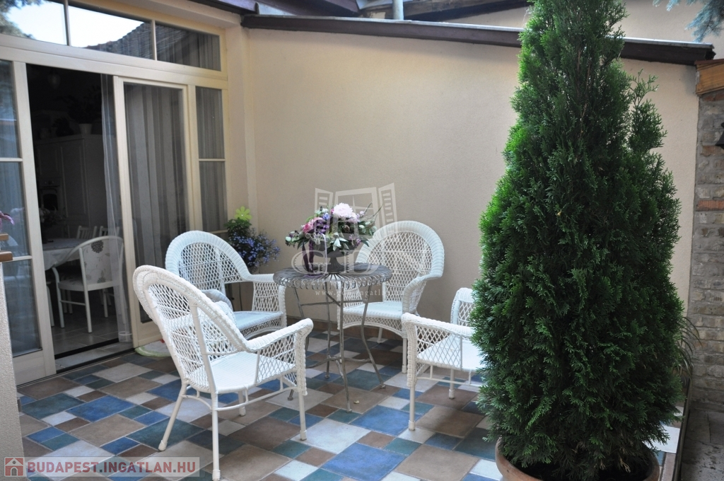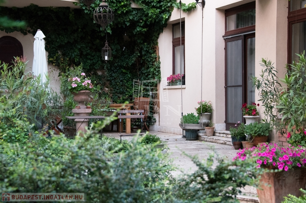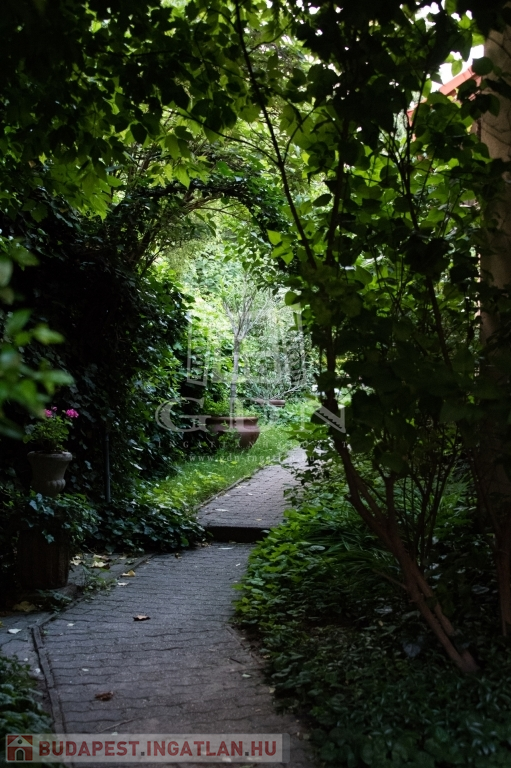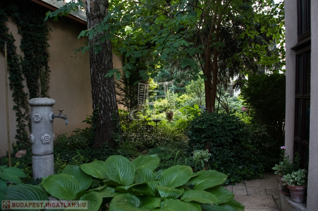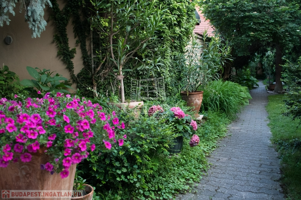 A ház legnagyobb értékes dísze a kert, őspark, mini arborétum. Egy beállt kert, különleges növények, fák, virágok sokasága, pergola, fedett terasz, gyermek játszó-faház, kerti ösvények teszik romantikus hangulatúvá, ahol több helyen van lehetőség pihenésre, főzésre, szabadtéri tevékenységekre. A levegő oxigén-dús, és a nyári melegben néhány fokkal alacsonyabb a hőmérséklet a telken, klímára nincs is szükség.