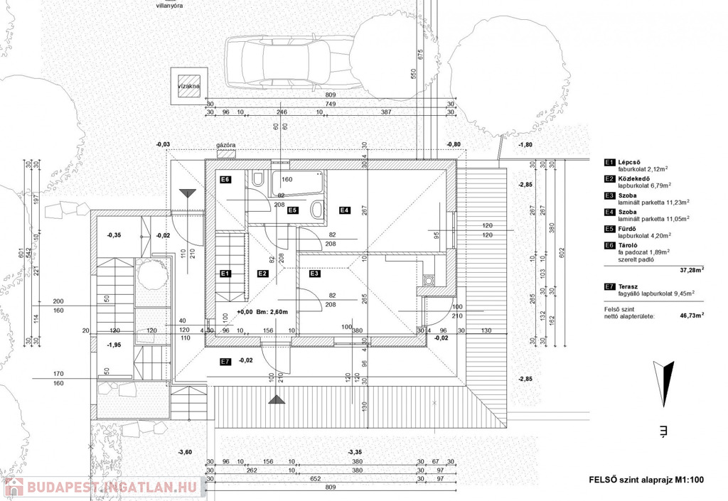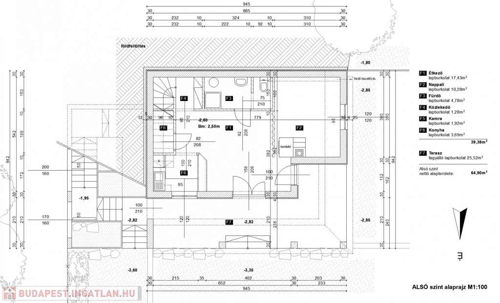 - helyiségek alsó szinten: közlekedő, konyha, étkező, nappali + terasz kapcsolattal, wc, fürdőszoba,