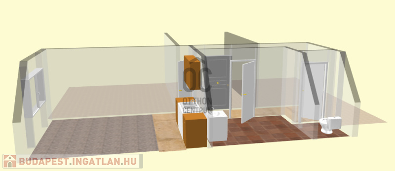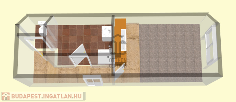 A lakásban szoba-konyha egyben található, a főzés infra főzőlappal megoldott, hűtőszekrény rendelkezésre áll.