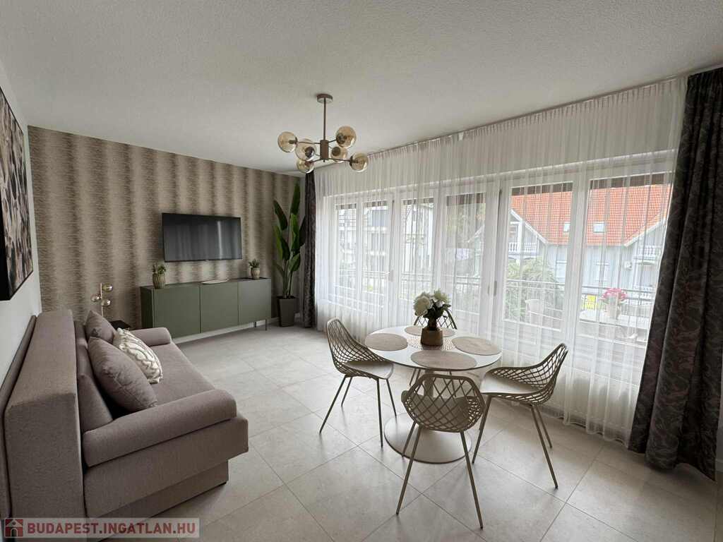 2026.06.15.-ig!!! Balatonlelle központjában, a Balaton parttól 100 m-re, gyönyörű zöldövezeti környezetben rendezett társasház 1. emeletén lévő 51 m2-es felújított iényes lakás kiadó. A lakásban egy szoba + amerikai konyhás nappali amelyből 10 m2-es terasz nyílik, előszoba, fürdőszoba-zuhanyzó-wc helyiségek találhatóak, a fűtése és a melegvíz ellátása kombi gázkazánnal megoldott, továbbá légkondícionáló is van felszerelve, valamint tartozik hozzá az épület zárt udvarában 1 szgk. részére beállóhely is. A lakás teljesen felszerelt, wifi és mindig tv van! A lakást a tulajdonosa legfeljebb 2 felnőtt részére kívánja kiadni, a dohányzás és a kisállat tartása nem engedélyezett! Bérleti díj: 140.000.- Ft/hó + rezsi + 2 havi kaució