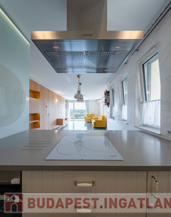 Modern, gépesített konyha: mosogatógép, hűtő, mélyhűtő, sütő, mikró, indukciós főzőlap