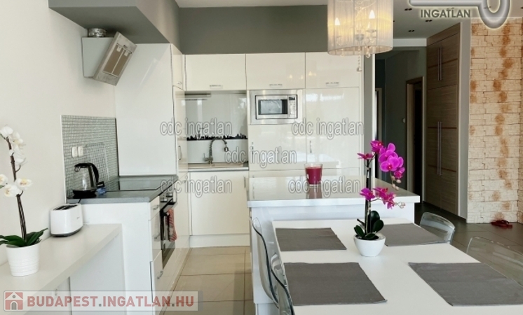 II. kerületben, Csatárka és Pálvölgy határában egy kisforgalmú, csendes utcában kiadó egy kis lakóközösségű társasház első emeleti lakása. Luxus minőségben felújított, világos, jó hangulatú, minőségi konyhával, ízlésesen berendezett. A 95 m2-es, nappali + 2 hálószobás, teraszos ingatlan rendkívül jó beosztású. A hálószobák külön nyílnak, az amerikai konyhás nappalihoz tartozik a 10 m2-es, kertre néző, panorámás terasz. A fürdőszobában kád és zuhanyzó is van, valamint egy wc és egy bidé. Közvetlen mellette van még egy wc kézmosóval. A lakás része még egy ablakos gardróbhelyiség is. Az ingatlan riasztóval ellátott, légkondícionált, fűtése cirkós, a nappali kandallós. A közös használatú kert folyamatosan gondozott, egy rendszeresen tisztított medencével is rendelkezik, melyet a lakók közösen használhatnak, csakúgy, mint a grillezőt. Parkolási lehetőség van a teremgarázsban, a kertben van egy kocsibeálló és még egy a ház előtt is. Az ingatlan minimum 1 évre kiadó, 2 havi kaució szükséges. A rezsi fogyasztás alapján fizetendő, a közös költség 100 Euro. Kisállatot nem lehet hozni, a dohányzás tilos az ingatlanban.
