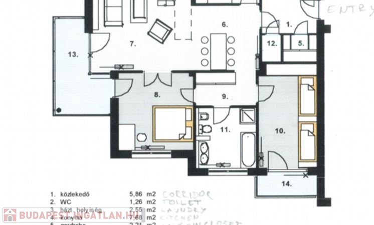 A lakás elosztása praktikus és kényelmes: nappali, 2 hálószoba, külön konyha, duplakomfortos fürdőszoba, valamint két nagy, napos terasz tartozik hozzá. A lakás klimatizált, a fűtésről gázkazán gondoskodik. A bérleményhez teremgarázs-beálló is tartozik, amely kényelmes parkolást biztosít a lakóknak.