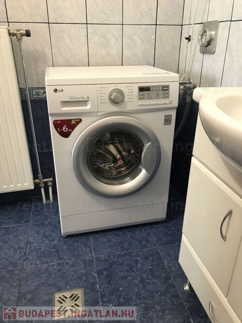A fürdőszobában zuhanykabin, mosdó, új mosógép.