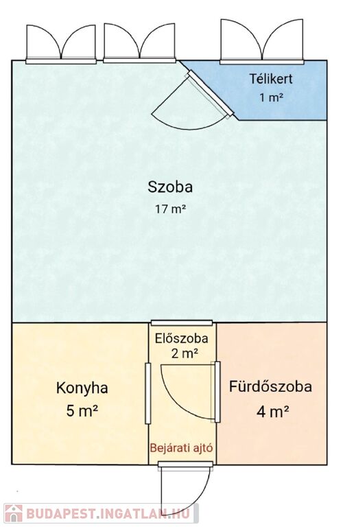 A szoba tágas és napfényes, az előszobából nyílik a minimalista konyha és a zuhanyzós fürdőszoba. Hűtőszekrény, gáztűzhely, tv és internet található az ingatlanban, a bútorzatot egy kinyitható kanapé és egy kör alakú étkezőasztal alkotja két székkel. Különlegessége egy elbűvölő kis télikert, ahol nyugodtan elfogyaszthatja a lakó a reggeli kávéját, miközben belemerül a természet látványába az otthon kellemes melegéből. A fűtés házközponti távfűtés. A lakás délnyugati tájolású, így mindig fényes és az est közeledtével is élvezhetőek a nap sugarai.