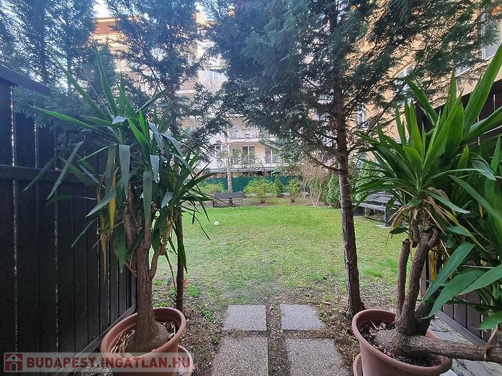 A házhoz zöld, nyugodt közös kert tartozik – ideális pihenéshez egy hosszú nap után