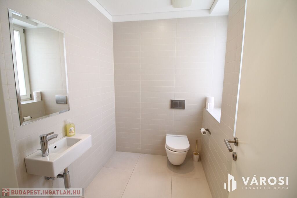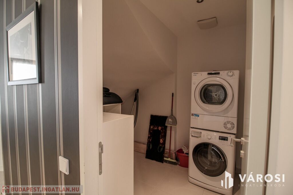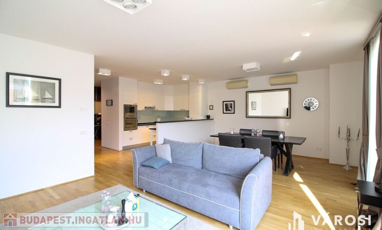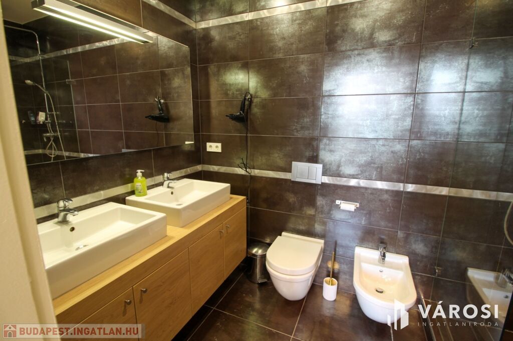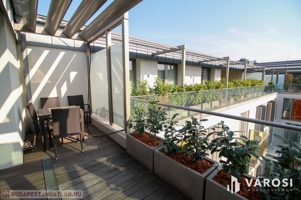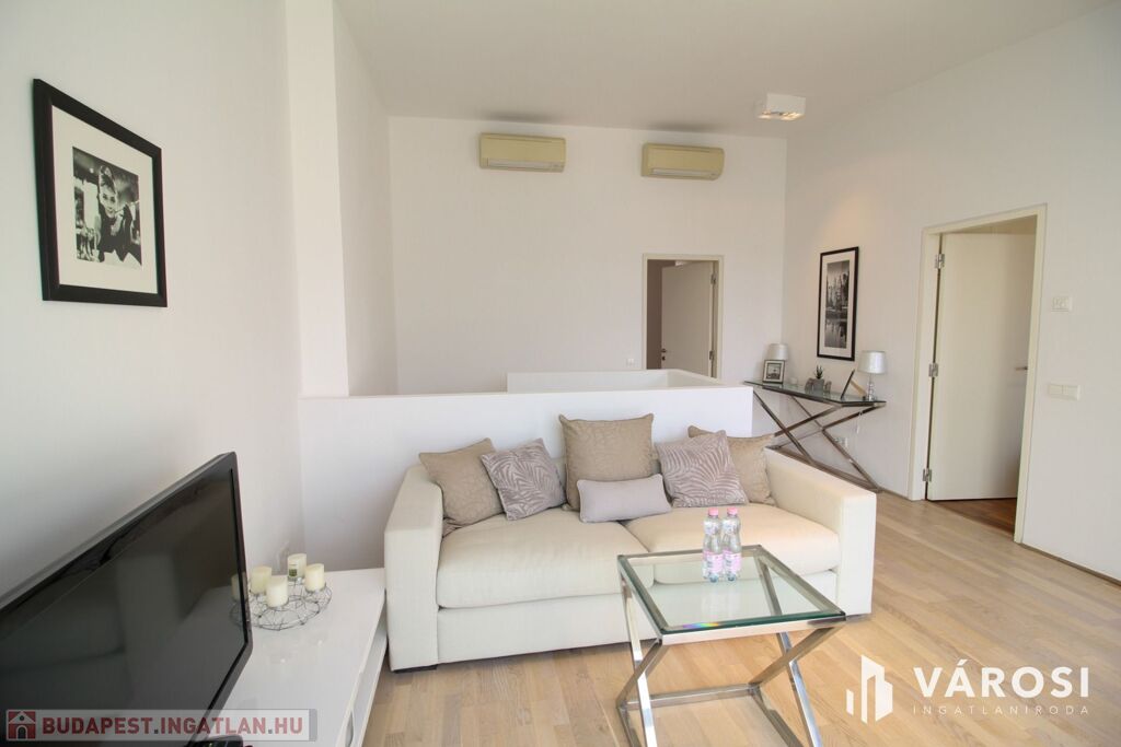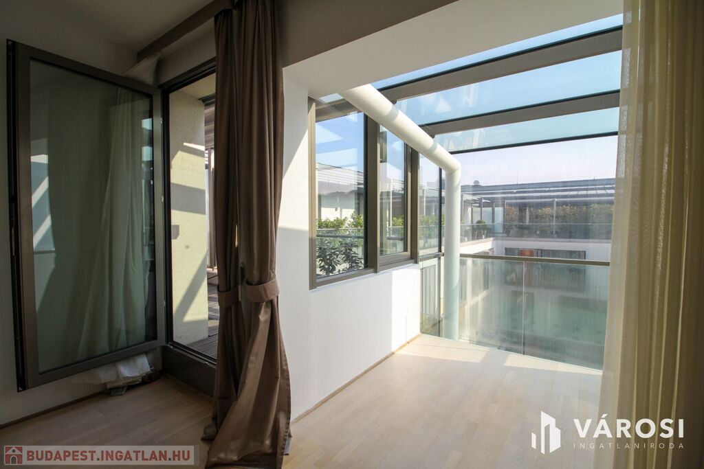 A duplex lakás az épület legfelső, 5. emeletén helyezkedik el, így az üvegplafon varázslatos kilátást enged az égboltra. A 140 m2-en található a bejárati szinten egy tágas és napsütötte amerikai konyhás nappali, egy vendégmosdó és egy tároló helyiség, vagy mosószoba, míg az emeleten van két hálószoba, melyekből külön saját fürdőszoba nyílik (az egyik fürdőkádas, a másik zuhanykabinos), egy panorámás nappali és egy hangulatos erkély. Bútorozottan és gépiesítve várja új bérlőit. A megfelelő hőmérsékletről házközponti fűtés gondoskodik, illetve egyedileg szabályozható fal-, padló-, mennyezetfűtéssel és légkondicionálóval.