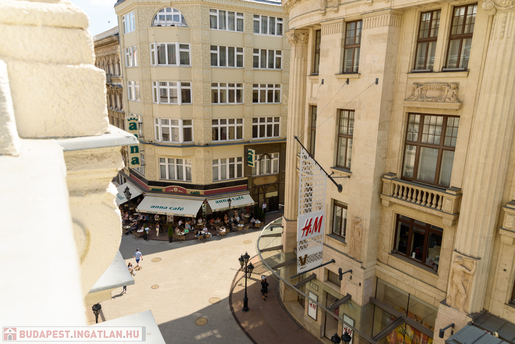 A nagy méretű 23 nm2-es Nappali ablakai a Váci utcára néznek kilátással a Vörösmarty térre.