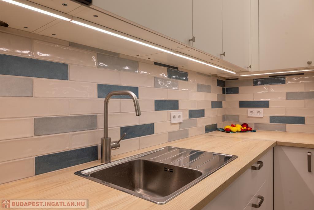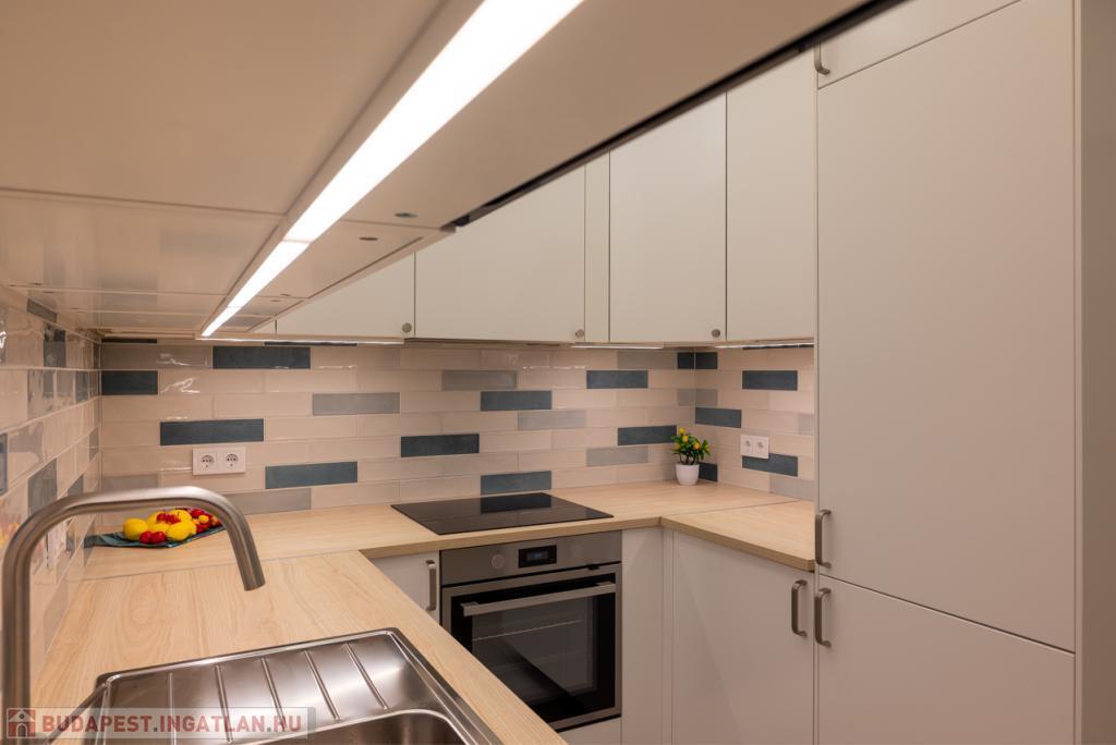 Konyhája gépesített (mosogatógép, mikró, hűtő).