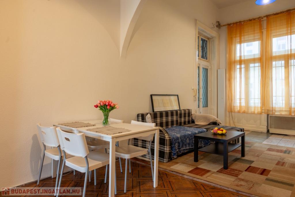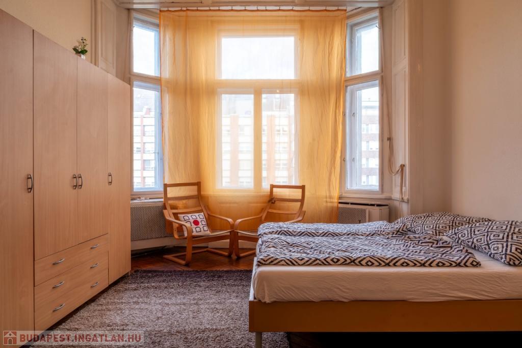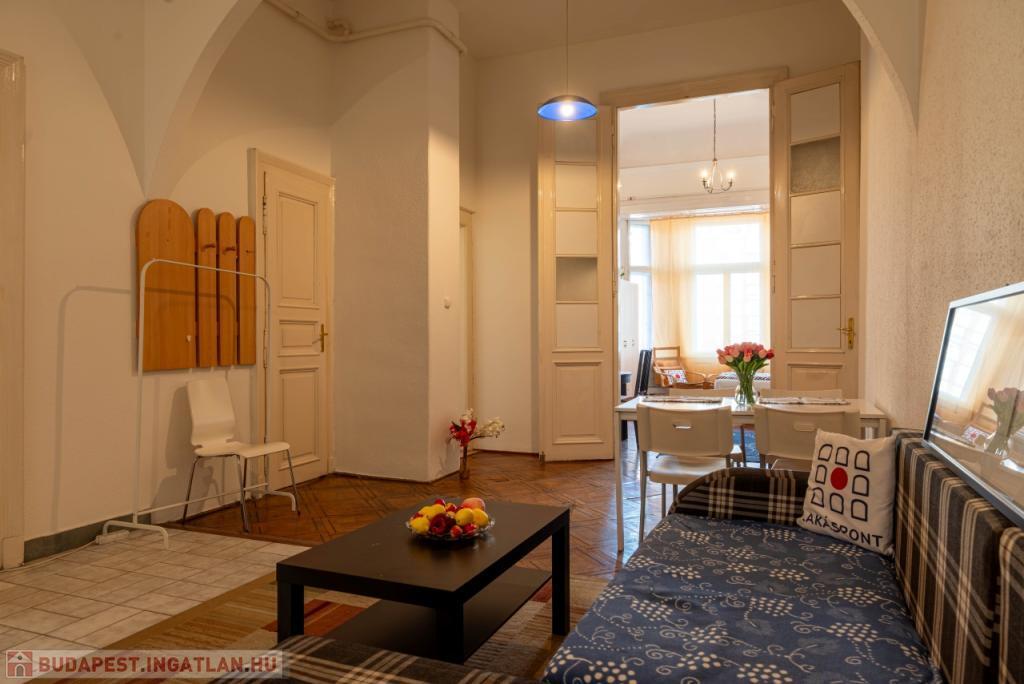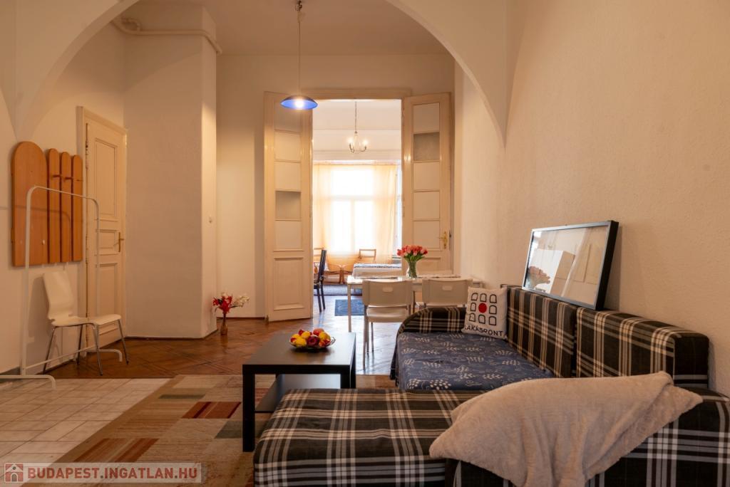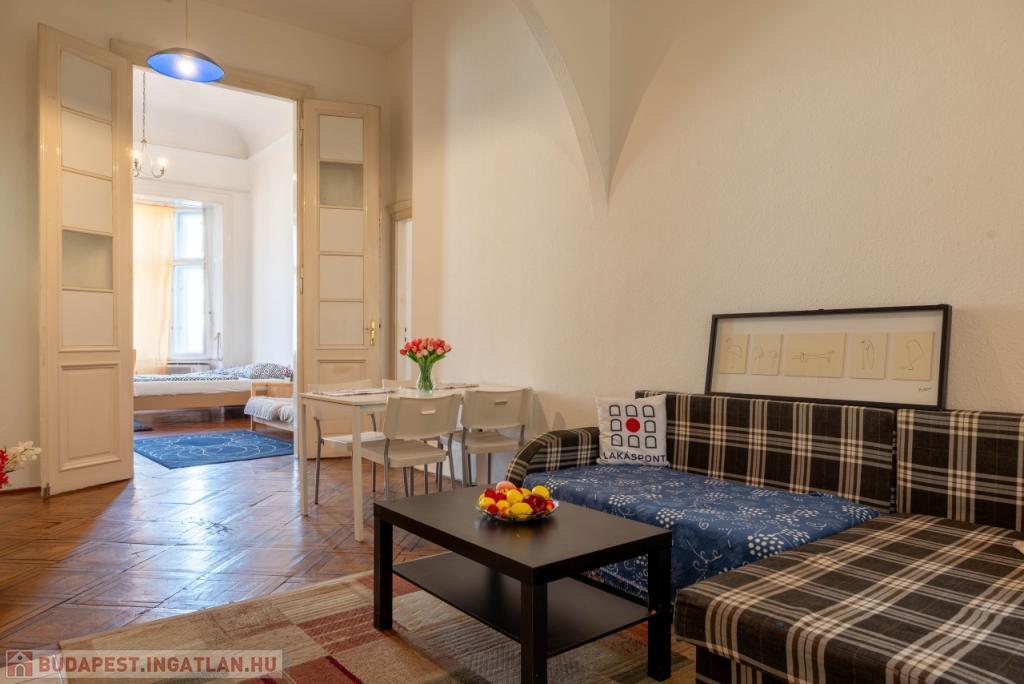 Budapest V. Deák térnél, a Károly körúton 3. emeleti, 100 nm-es, lépcsőházból nyíló, 1 nappali-étkező, 3 hálószobás, gépesített és felszerelt, IKEA bútorokkal berendezett, fiatalos, hangulatos lakás kiadó, akár csak júniusig is, 10 hónapra.