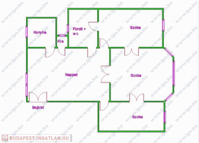 Szobák teljesen külön nyílóak, 24, 30 és 24 nm-esek, egybe is nyithatóak, mindegyikben franciaágy és mindhárom utcára néző. Fürdőszoba kádas, WC-vel