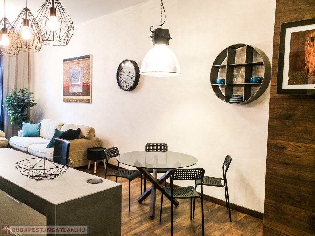 A lakás elrendezése: tágas amerikai konyhás nappali, külön nyíló hálószoba, gardróbhelyiség, dolgozósarok, valamint igényes, külön fürdőszoba.