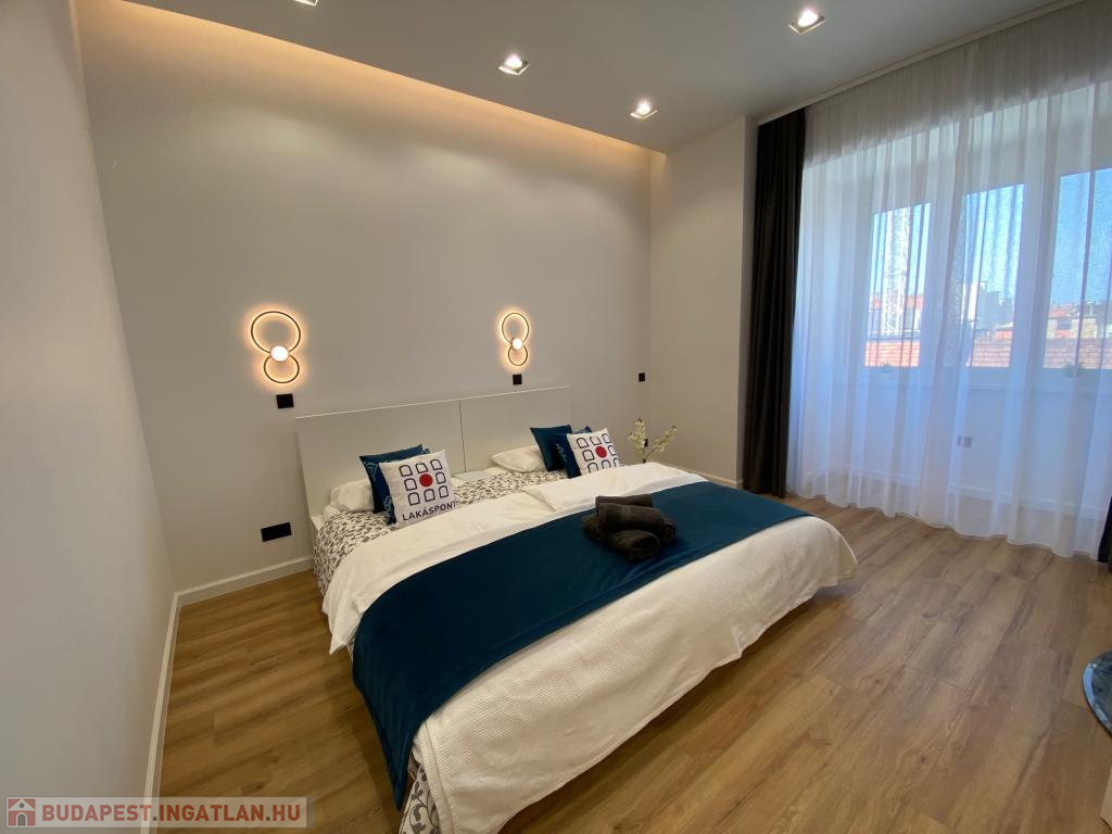 A nappaliból elérhető hálószoba nyugodt, csendes légkört biztosít, a hozzá kapcsolódó, külön gardróbhelyiség pedig praktikus és stílusos megoldás minden igényes bérlő álma.