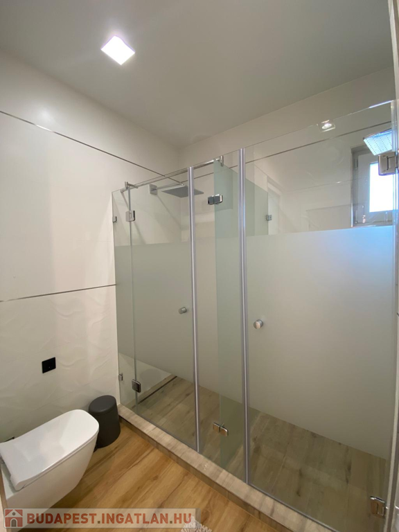 A fürdőszoba elegáns burkolatokkal, két különálló zuhanyzóval és WC-vel rendelkezik, így akár két személy is kényelmesen, egymástól függetlenül készülődhet reggelente. Az ablakos kialakításnak köszönhetően jól szellőztethető.