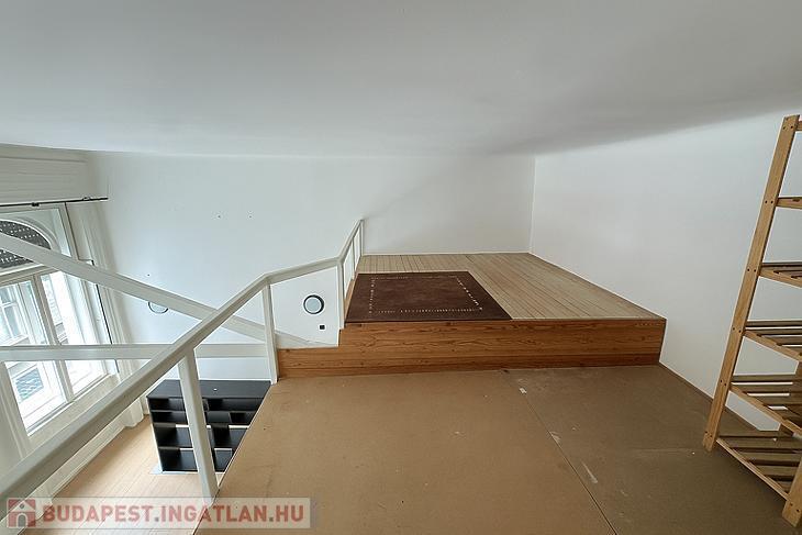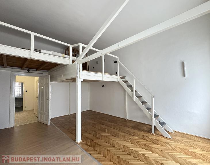 Kiadó egy világos, délnyugati tájolású, galériás egyszobás lakás a VI. kerületben, a Nagymező utca 37–39. szám alatti liftes téglaépület második emeletén.