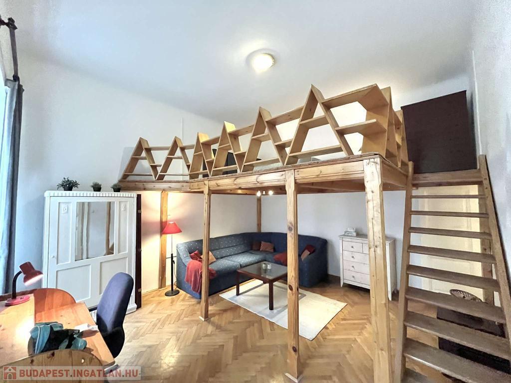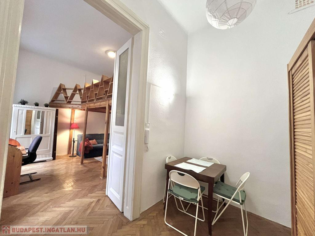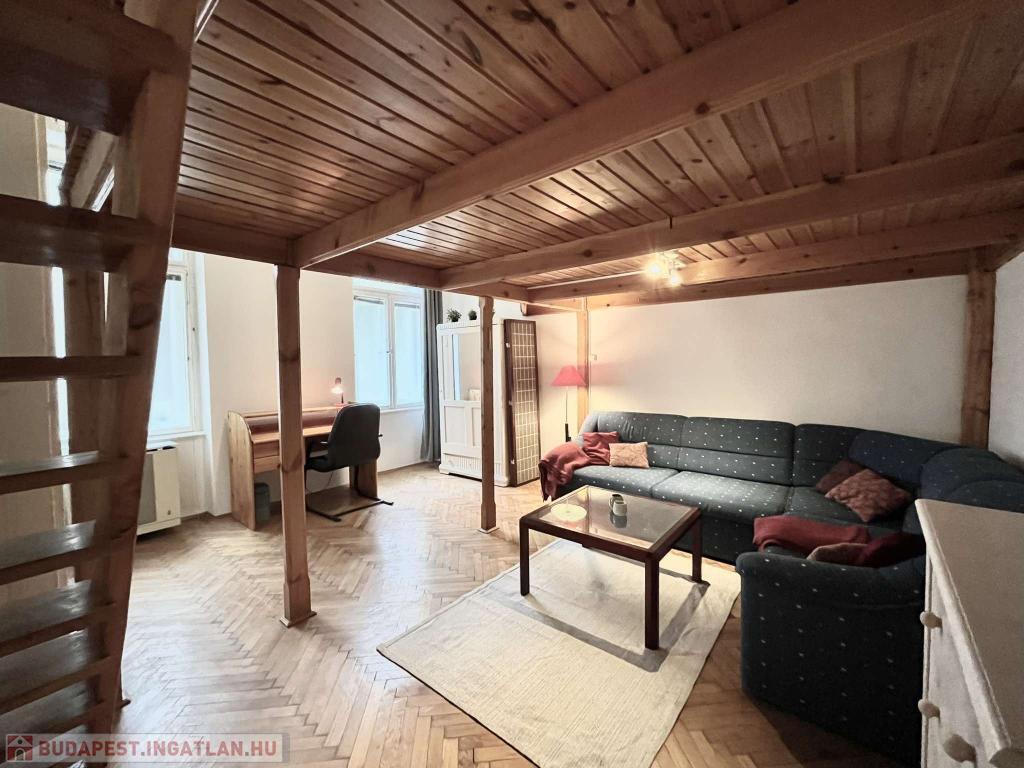VI.kerület-ben NYUGATI közelében, kulturált környéken, az Eötvös utcában, PATINÁS, JÓL KARBANTARTOTT épületben II. emeleti 44 m2-es galériás jó hangulatú kislakás kiadó november 12-től bútorozottan, gépesítve!