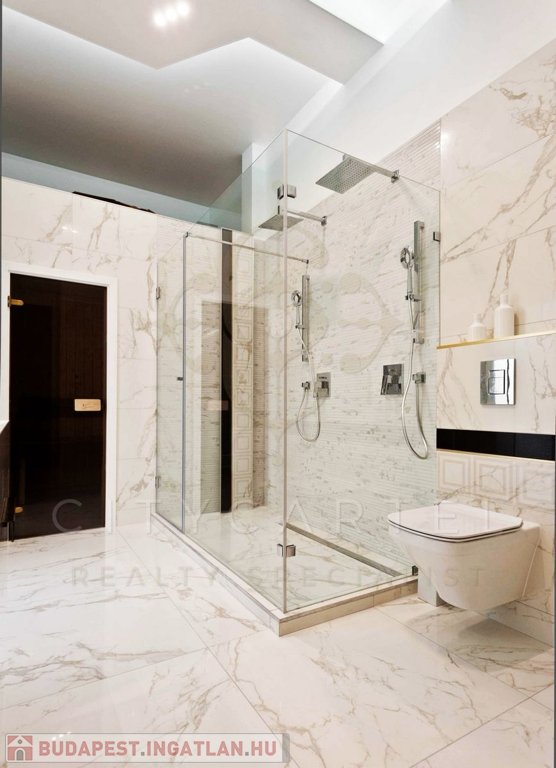 A fürdőszobákban Valentino és La Fabrica burkolatok, valamint Duravit és Grohe szaniterek találhatók. Az egyedi tervezésű bútorok és törölközőszárítók tovább növelik az exkluzivitást, az egyik fürdőszobában pedig egy Ravak hidromasszázs kád biztosítja a pihenés élményét.