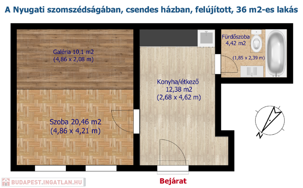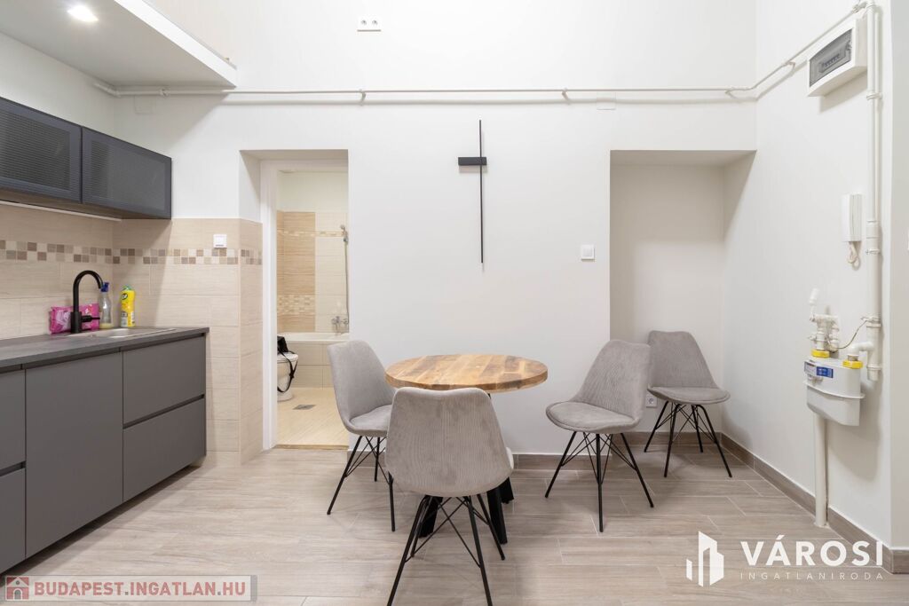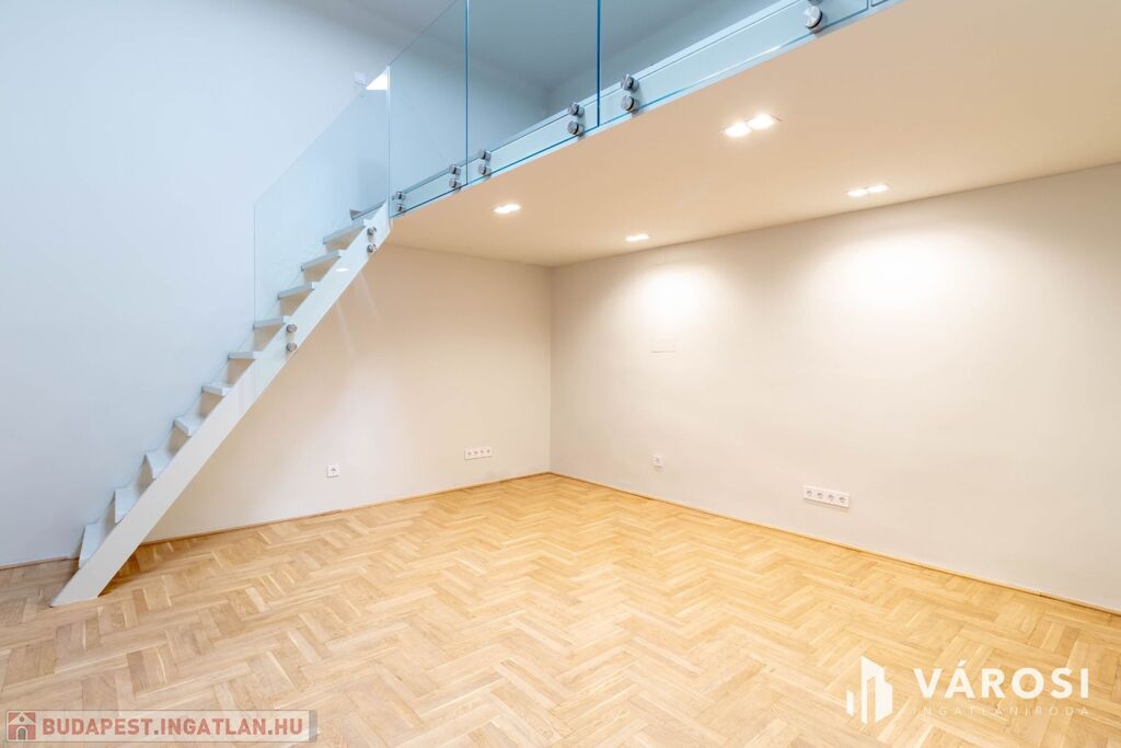 Az ingatlan alapterülete 36 m2, azonban a 20 m2-es szoba a nagy belmagasságnak köszönhetően kapott még egy 10 m2-es, elegáns megjelenésű álló galériát is, mely növeli a használható teret és lehetőséget ad egy, a nappalitól elkülönített hálószoba kialakítására.