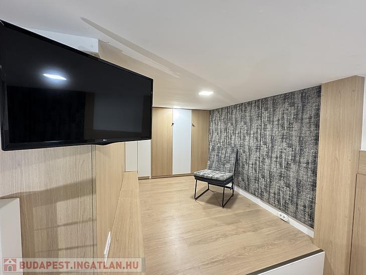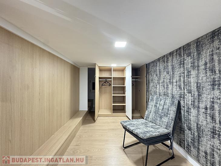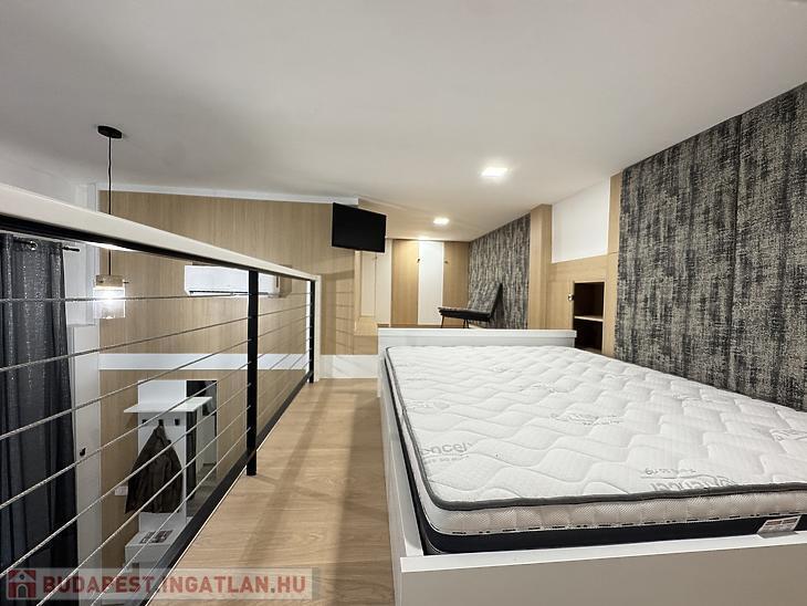 A galérián beépített szekrények biztosítanak bőséges tárolóhelyet, a fürdőszoba zuhanyzós kialakítású.