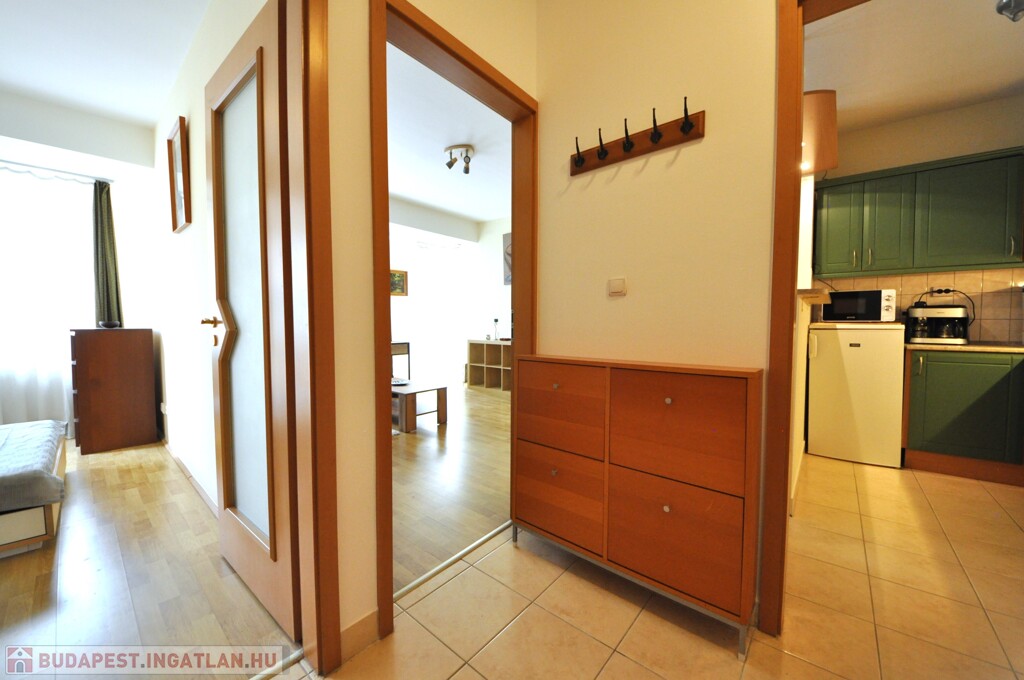A hálószobában beépített gardrób szekrény és franciaágy, a nappaliban kihúzható kanapé, étkező asztal, íróasztal és néhány könyvespolc is található.