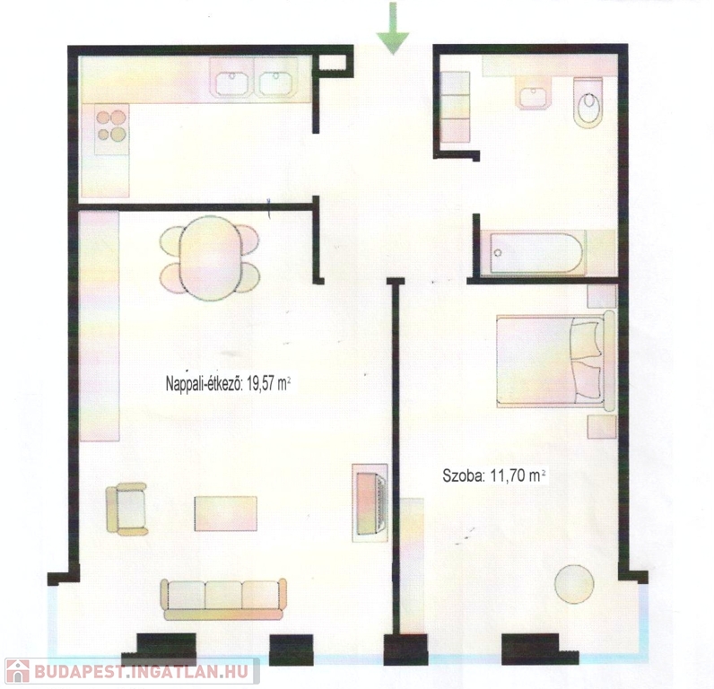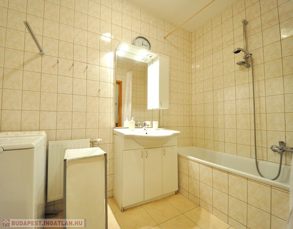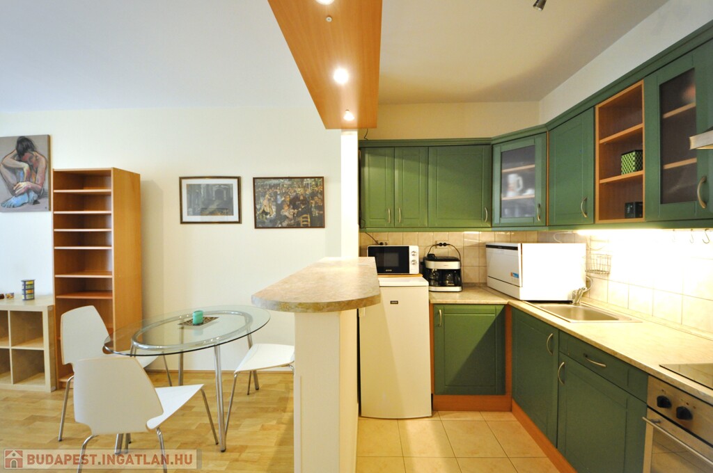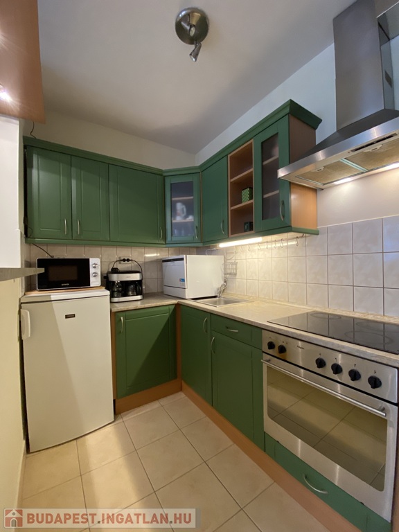 Beosztását tekintve, nappali + 1 szoba, gépesített (elektromos sütő, kerámia főzőlap sütő, elszívó, hűtőszekrény, mini mosogatógép) amerikai konyha, - kádas, mosógéppel is szerelt- fürdőszoba is található az ingatlanban az előszoba mellett.
