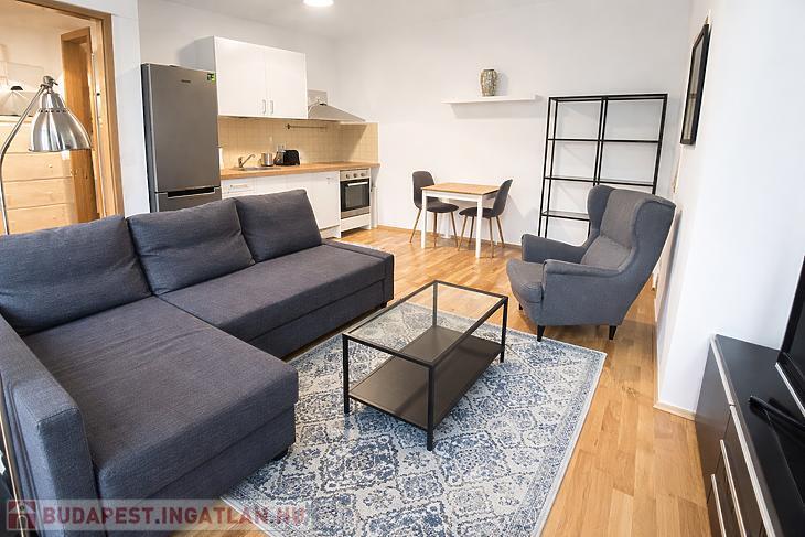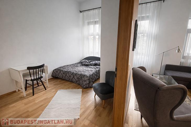 Budapest VI. kerületében, a Vörösmarty utcában, új építésű, modern, portaszolgálatos társasházban kiadó egy 41 m²-es, felújított, világos lakás.