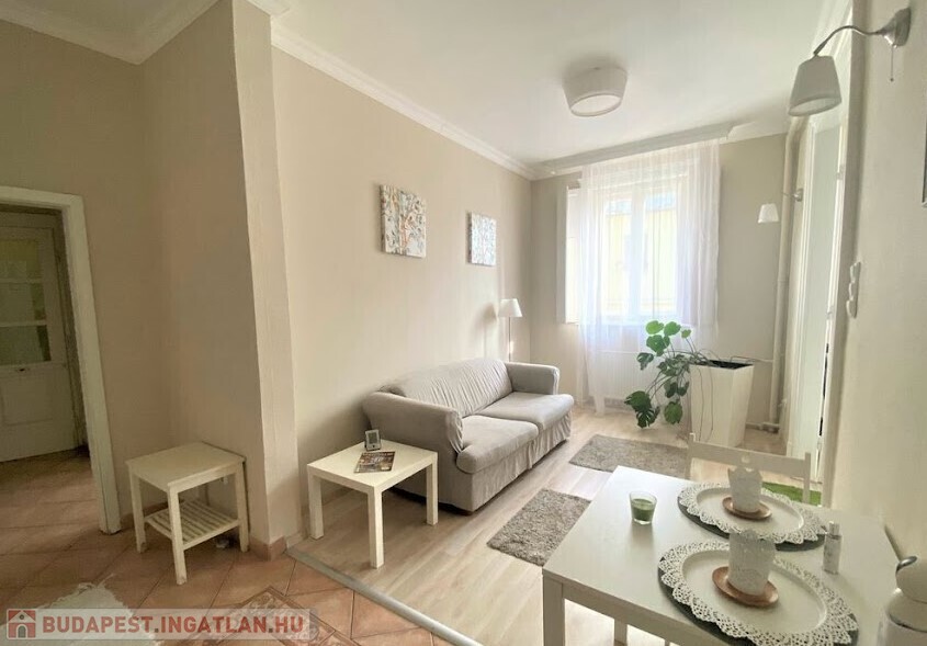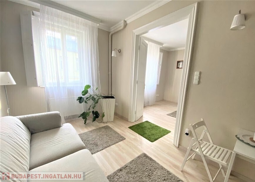 rendezett, liftes, folyamatosan karbantartott ház V.emeletén, egy 65 nm-es, amerikai konyhás nappalis, 2 hálószobás (külön nyílóak) bútorozott, gépesített (mosogatógép, mosógép, hűtő, stb.), belső kertre néző lakás.
