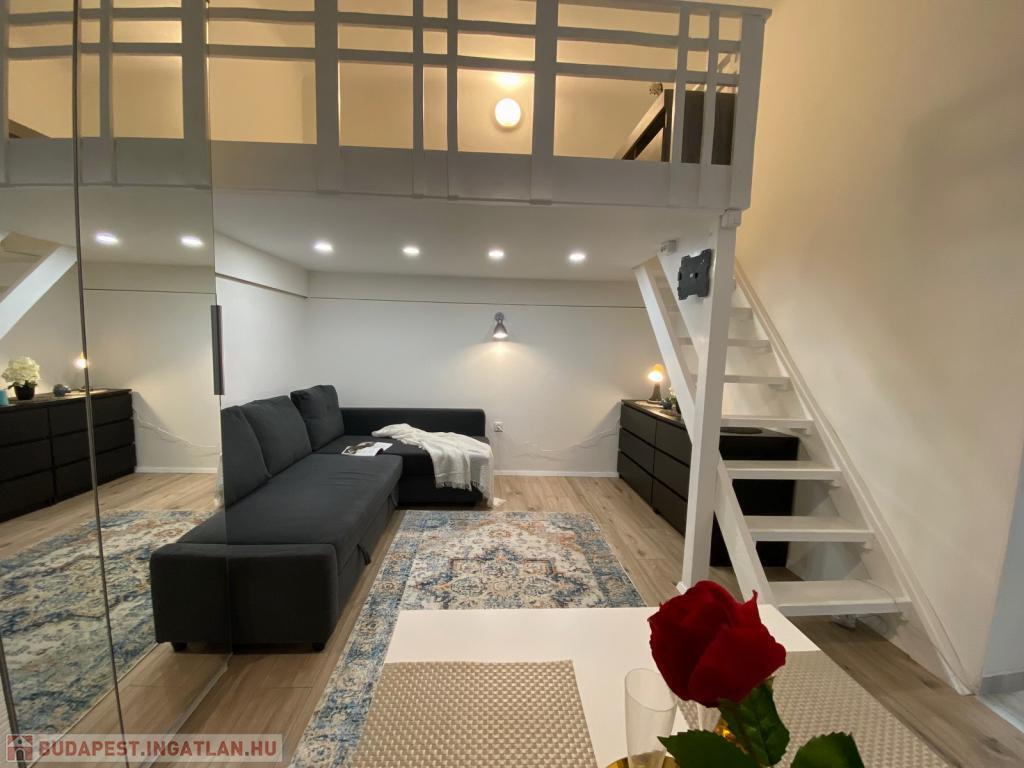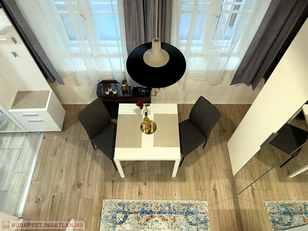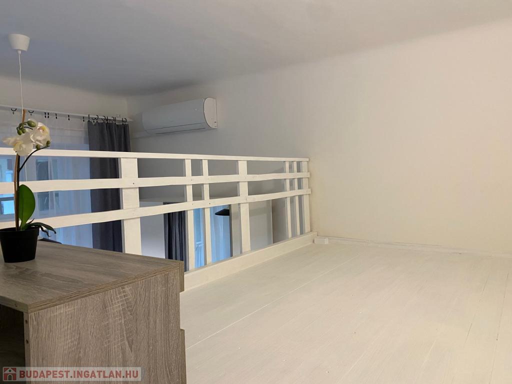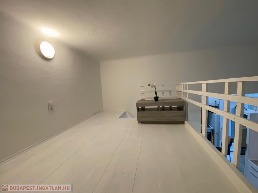A csendes, belső udvarra néző szoba fiatalosan bútorozott, az alvógaléria pedig extra életteret biztosít, így a lakás tágasabb érzetet kelt. A matrac jelenleg nincs a lakásban, így a leendő bérlő a saját kényelmének megfelelőt hozhatja magával.