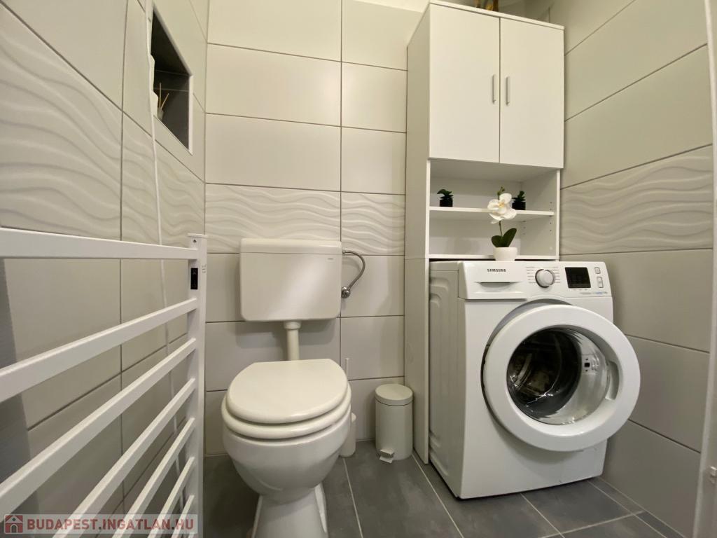 A fürdőszoba zuhanyzós, WC-vel egyben, itt kapott helyet a mosógép is, a meleg vizet villanybojler biztosítja.