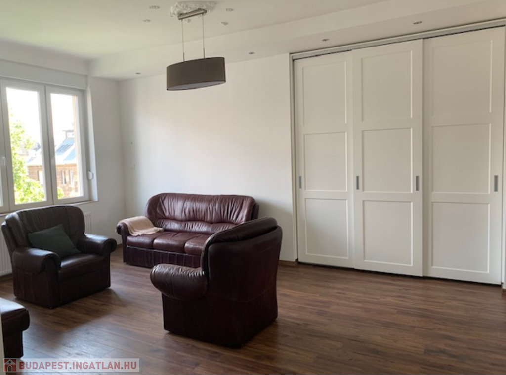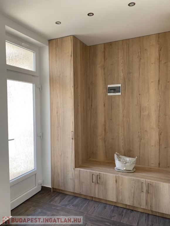 A lakás csendes-világos, gépesített, részben bútorozott, de hatalmas beépített szekrényekkel rendelkezik.