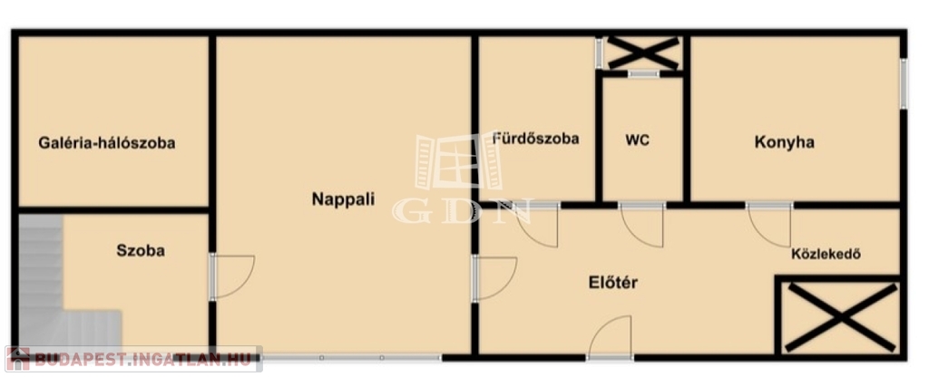 Az ingatlan tulajdoni lapon 63 m2, de a hasznos alapterülete több, mint 75 m2, mivel a nagy belmagasságnak köszönhetően az egyik szobában teljes értékű állógaléria került kialakításra.