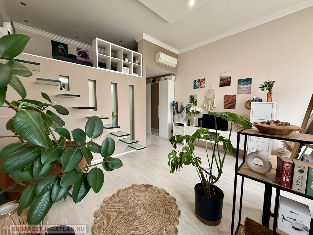 Kiadó Rákóczi úthoz közel a Fiumei úton egy 3 emeletes lift nélküli téglaépítésű társas házban lévő galériás, fürdőkádas, amerikai konyhás nappali, spejzzal, bútorozott, gépesített lakás.