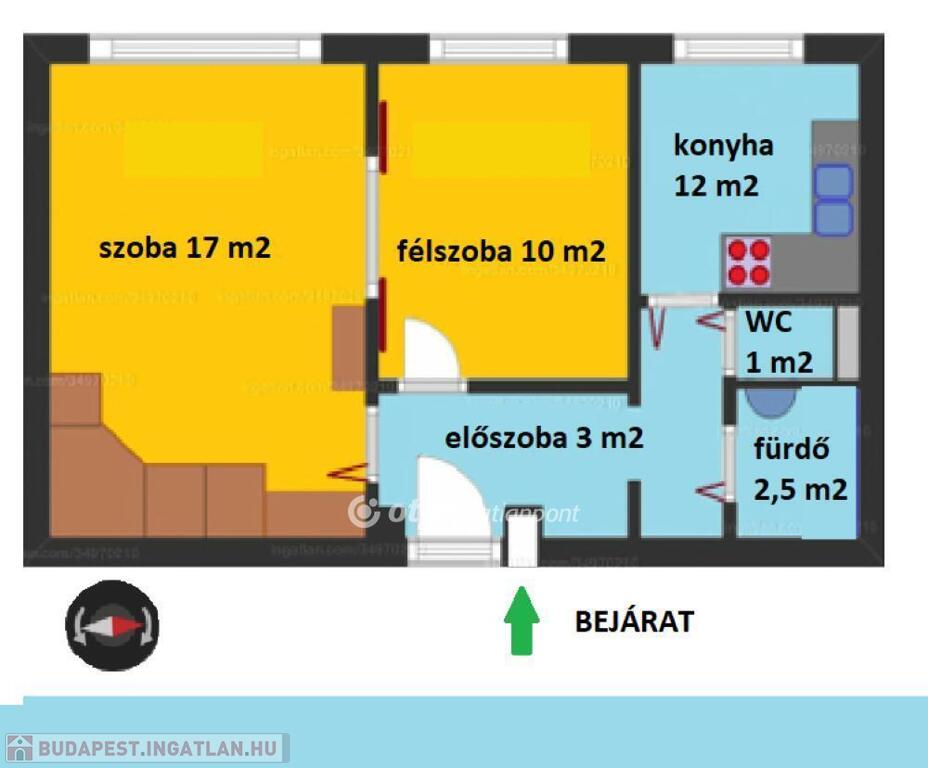 A nappali és a félszoba külön is nyíló, de körbe is járható, a konyha gépesített, a fürdőszoba kádas.