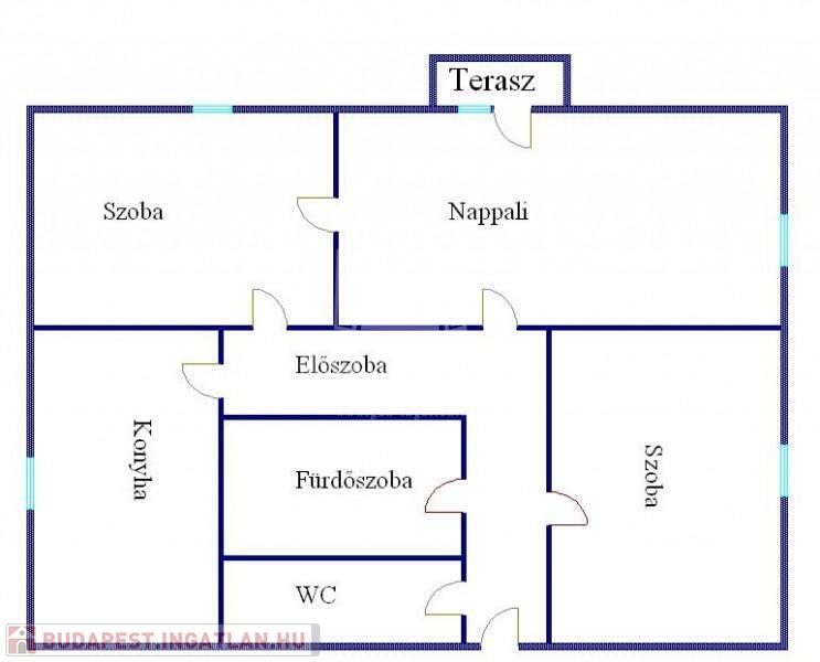 Helyiségei: előszoba, konyha+étkező, WC, fürdőszoba+WC, nappali+2 szoba, erkély(3m2).