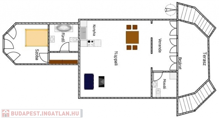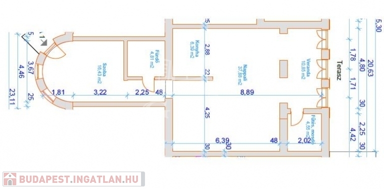 A nappali, konyha és étkező keleti tájolású, kertre néző, innen nyílik a terasz is.