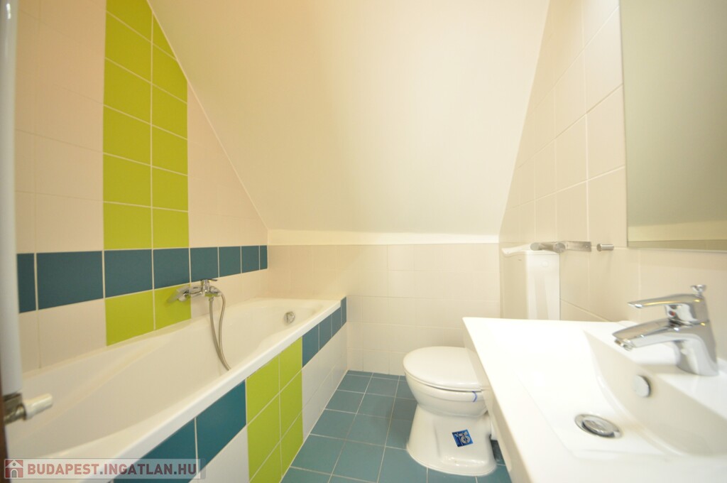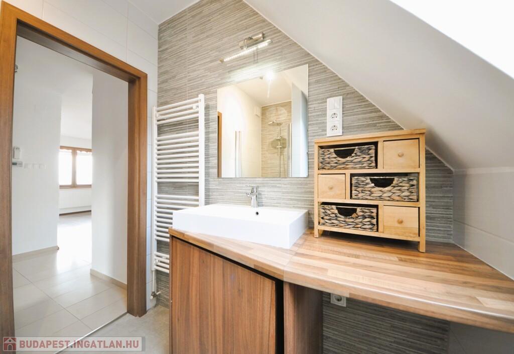 A felső szinten egy közlekedődből nyílik a lakás minden további helyisége, a kádas fürdőszoba, valamint két, jól használható méretű hálószoba.