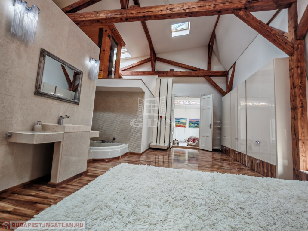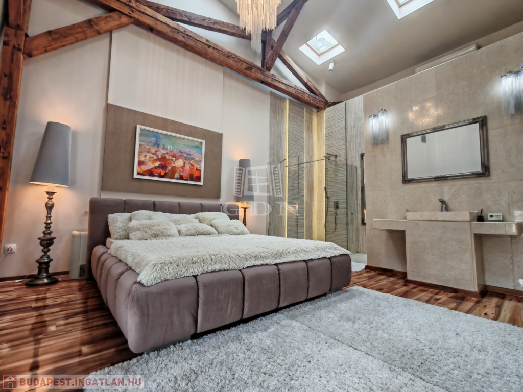 Ebből a különleges hangulatú hálószobából belső személyi lift visz fel az infraszaunához. Innen néhány lépcsővel elérhető a fából kialakított tetőterasz csodás panorámával. Tűzijáték páratlan élményt nyújt innen!