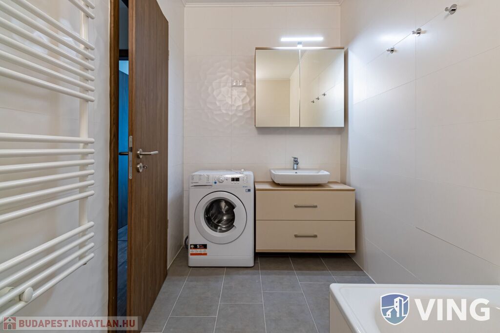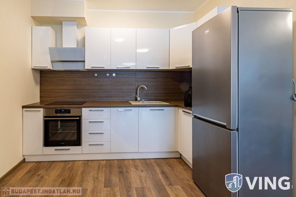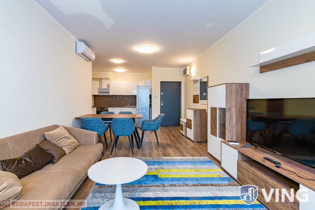 A lakás a képeken látható prémium bútorokkal és gépekkel van esztétikusan berendezve.
