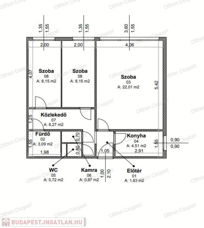 • 56 m² – 1+2 félszoba, jól szeparált terek